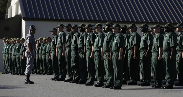 在清晨的升旗仪式中,一名犯人立正于队列中。